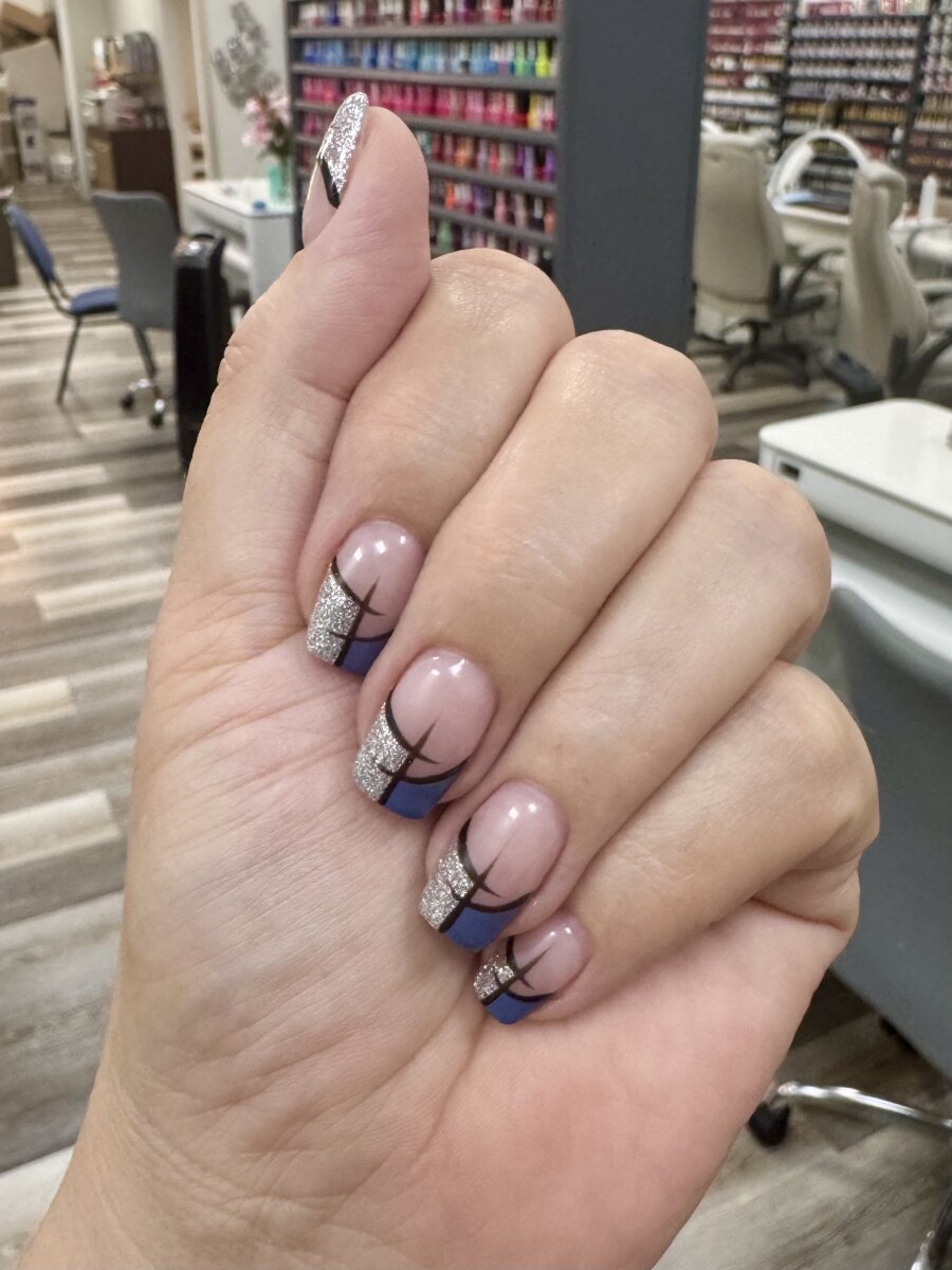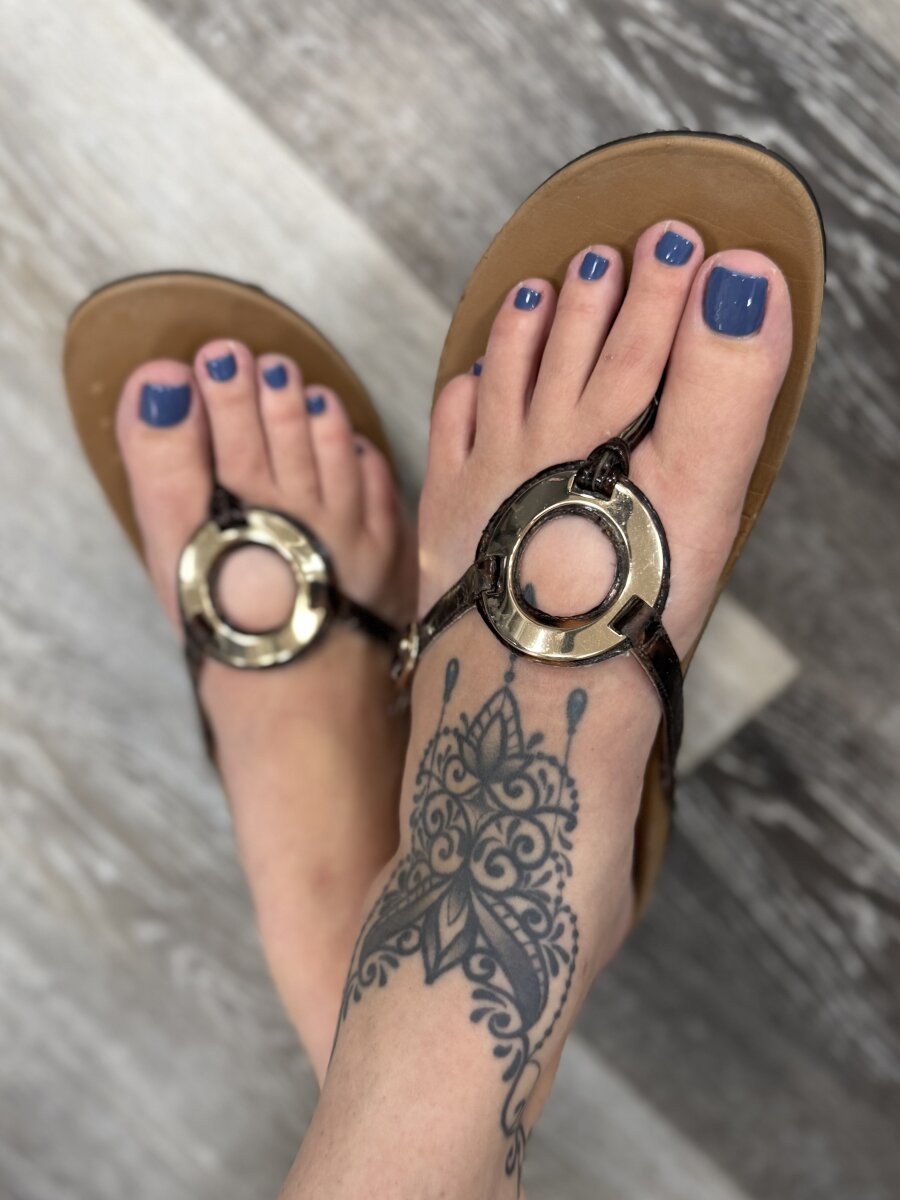 Feeling blue? Look at these fresh toes and you will perk right up. #longtoes #blue #sexyfeet #pedicure #sandals #tattoos #bigfeet #matchingnails