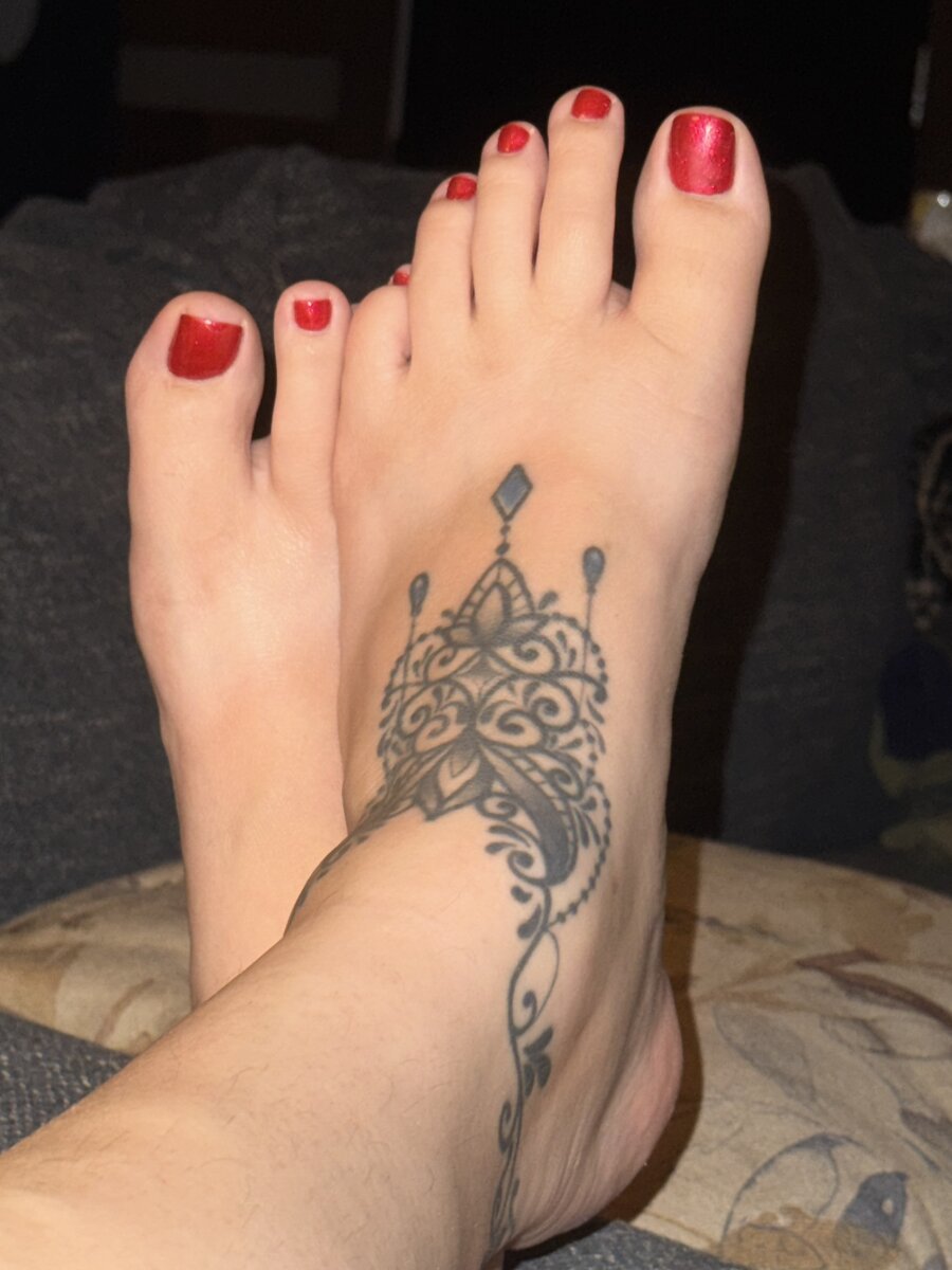 Isn't red the best color? What should I do next? Who wants personalized content? Hit me up. #longtoes #polished #tattoo #customcontent #redissexy