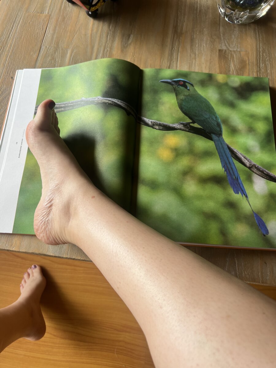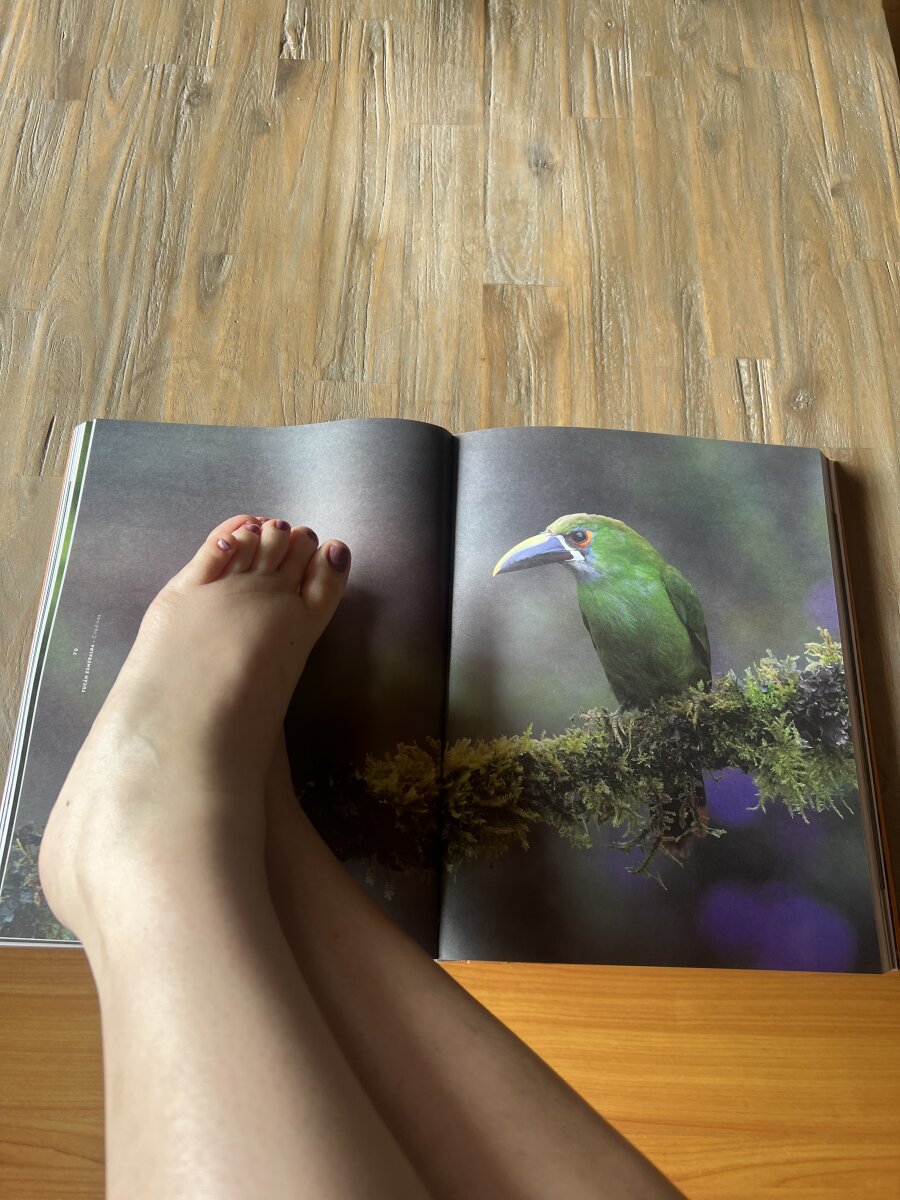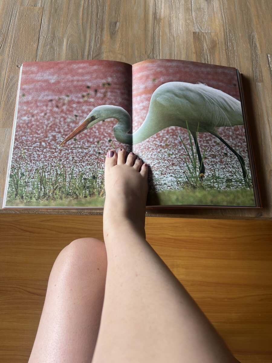 “Cazando miradas sin decir una palabra. Un libro abierto, aves silvestres, y un pie que interrumpe la escena como si perteneciera a otro plano. Uñas pulidas en tono malva y una postura despreocupada que dice más de lo que parece. ¿Quién mira a quién? ¿El ave curiosa o tú, atrapado en esta pausa íntima entre páginas?”**