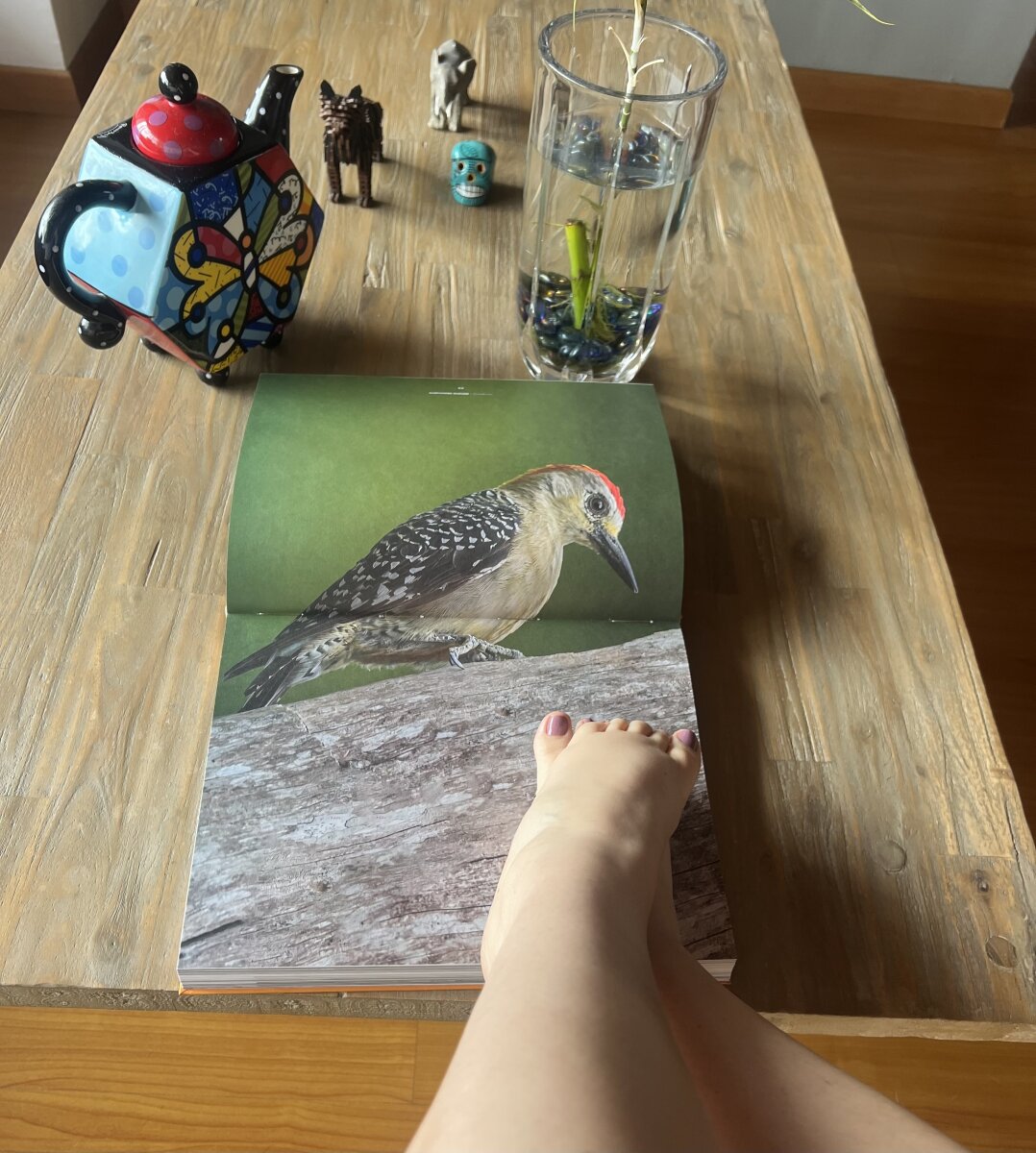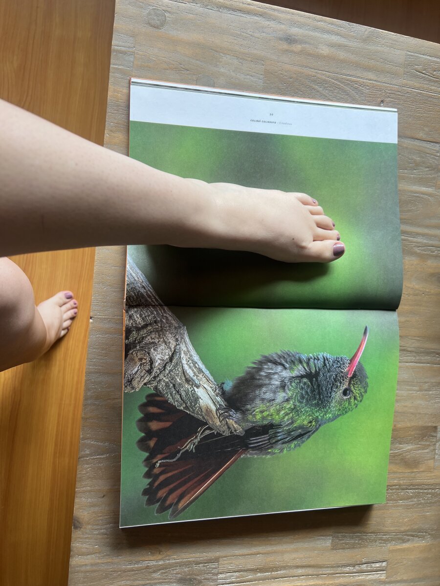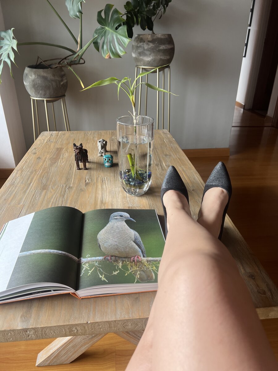 “Cazando miradas sin decir una palabra. Un libro abierto, aves silvestres, y un pie que interrumpe la escena como si perteneciera a otro plano. Uñas pulidas en tono malva y una postura despreocupada que dice más de lo que parece. ¿Quién mira a quién? ¿El ave curiosa o tú, atrapado en esta pausa íntima entre páginas?”**