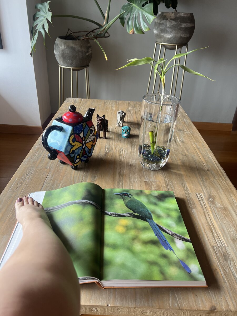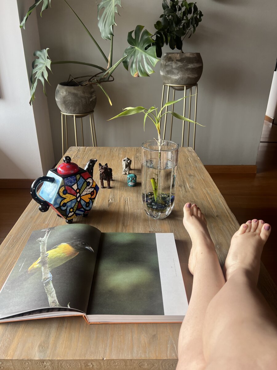 Me regalo este instante solo para mí. Estiro las piernas sobre la mesa, sintiendo la caricia del aire en mi piel y el sol que se cuela suave por la ventana. Mis pies, con las uñas pintadas de lavanda, descansan mientras me dejo envolver por el silencio, las plantas, y el susurro del libro abierto frente a mí. Todo es suave, lento… como un suspiro que se alarga sin prisa.”