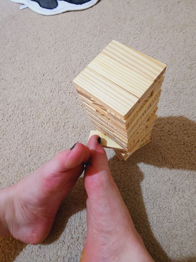 I've discovered a new skill, I can play jenga with my toes! Unlock this almost 4 minute video of me taking jenga blocks out with my toes one by one until they all fall down.
