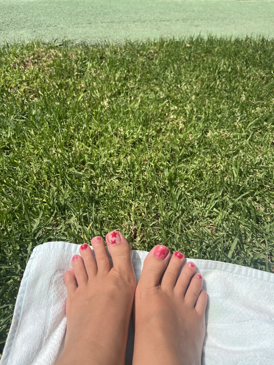 Pies piscineros ☀️⛱️⭐️ #pintauñas #rojo #rosa #cesped #toalla