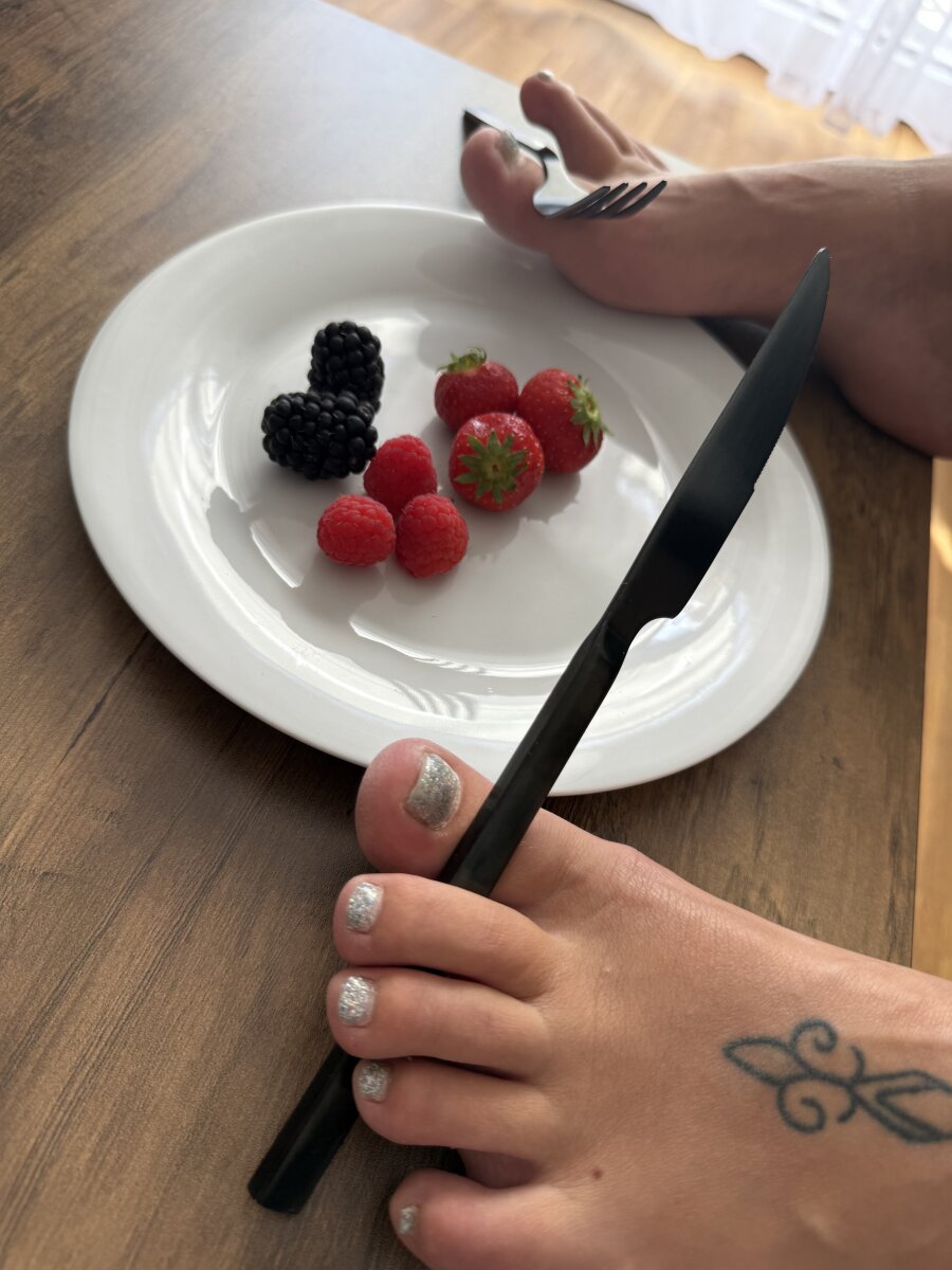 π Breakfast is served... but not the way you expected. My soft soles rest on the table, with a fork and knife teasingly held between my toes β ready to feed your fantasies. Can you handle this kind of temptation? π£π