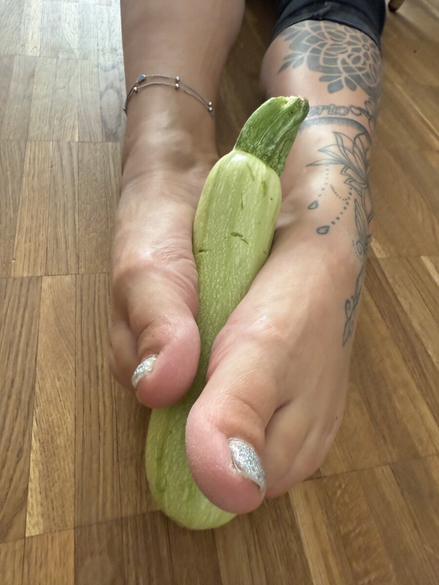 π₯ Still hungry? Or do you prefer something a little... thicker for breakfast? My feet now hold a firm zucchini between my toes β playful, bold, and just a bit naughty. Letβs see how much appetite you really have. π£π